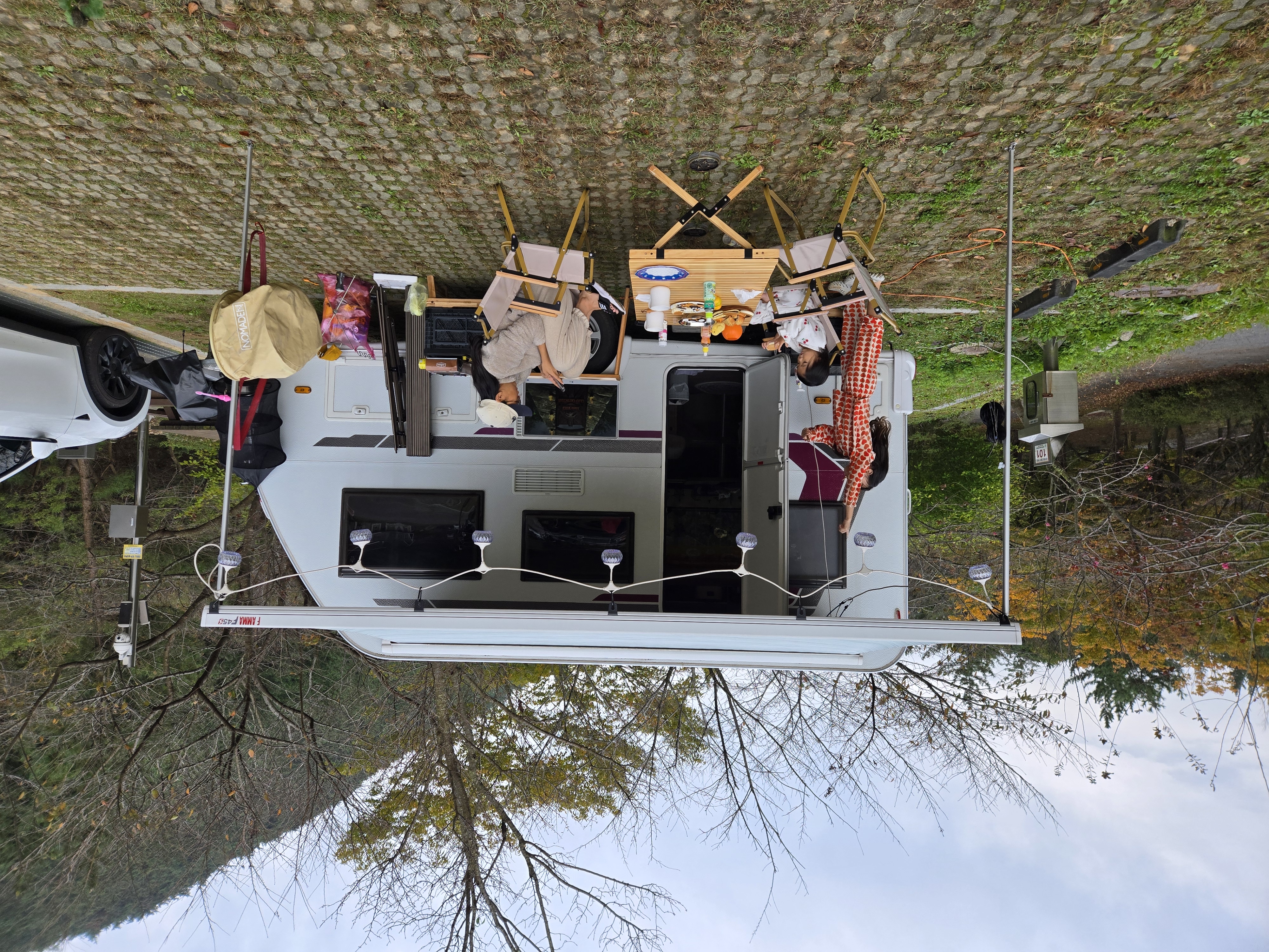 입실 후 바로 전용 자리에 저희 카라반을 세팅했습니다. 가장 중요한 것은 사이트의 평탄도와 전기/배수 시설인데, 희리산은 관리가 잘 되어 있어 세팅이 매우 편리했습니다.