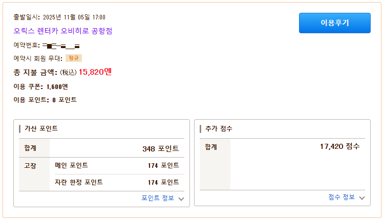 ㆍ 총평: 자란넷 최저가 예약과 뛰어난 연비의 도요타 아쿠아 덕분에 15,820엔이라는 합리적인 가격으로
