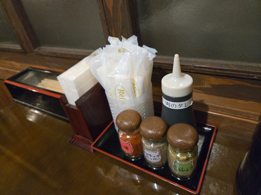 테이블에 깔끔하게 준비된 양념과 수저통. 추가 소스를 기호에 맞게 사용하세요.