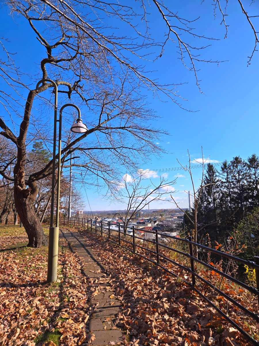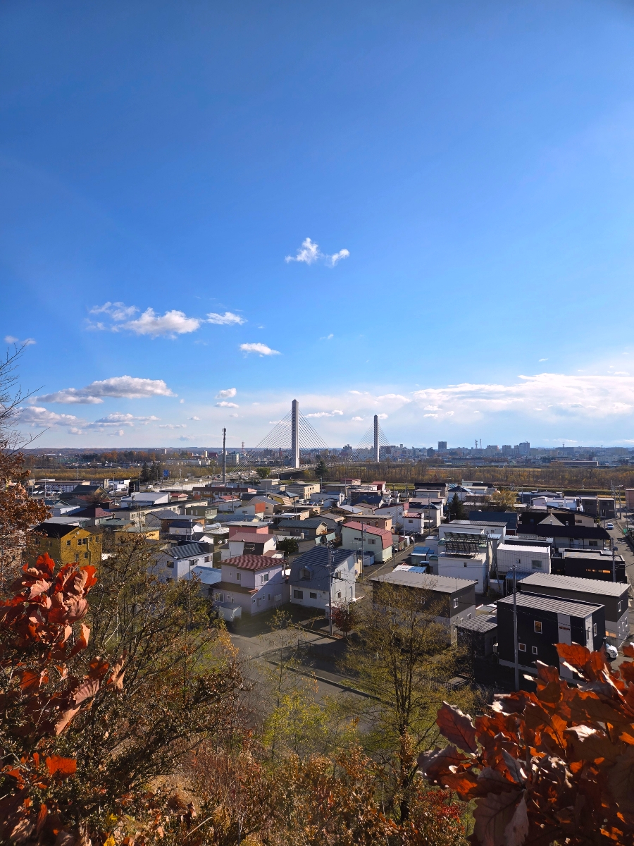 우연히 발견한 스즈란 공원 전망대. 가을 낙엽과 함께 도카치 대교가 보이는 시내 전경이 평화롭습니다.
