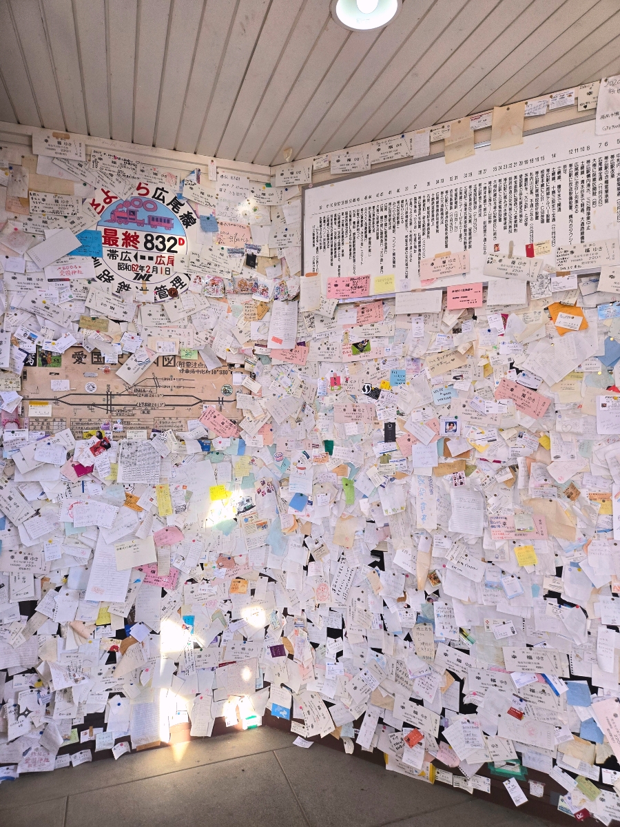 역사 내부: 역 내부에는 과거 사진, 티켓, 그리고 방문객들의 손편지 문구들이 가득 붙어 있어 옛 분위기를 느낄 수 있습니다.