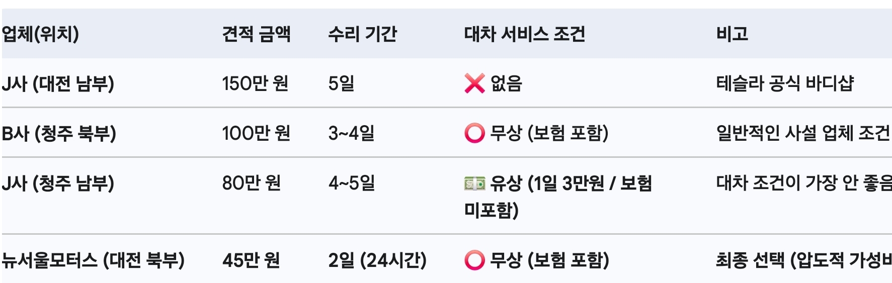 테슬라 공식 바디샵부터 사설 업체까지 발품을 팔아 비교해 보았습니다.