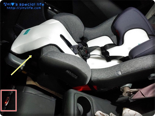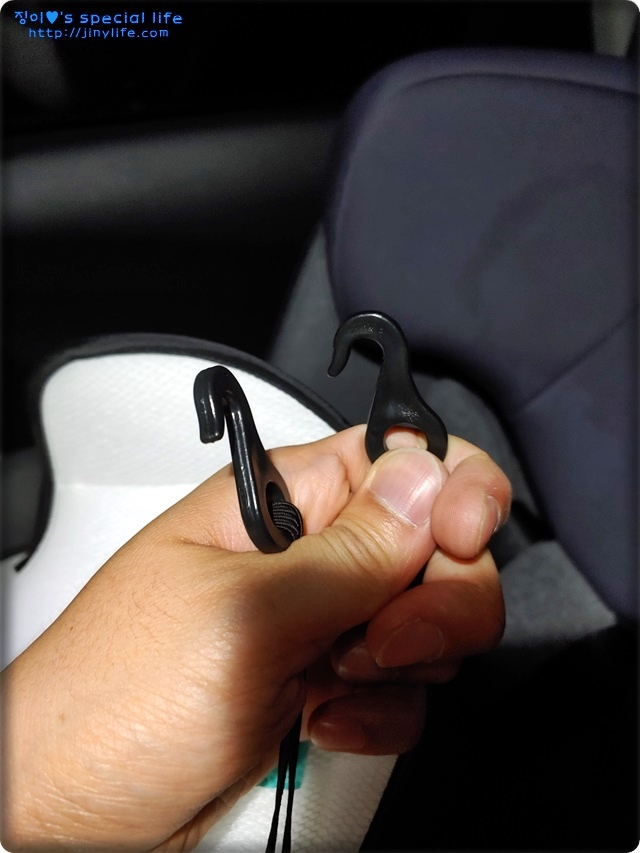 카시트 머리 뒤쪽에 걸 수 있는 부분을 찾아서 고리를 걸어 줍니다.