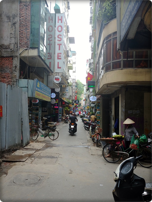 이제 마지막 호텔 골목으로 들어섰다. 베트남 전통 모자인 "농"을 쓰시고 자전거에서 과일 판매 중이신 아주머니, 공사장에서 힘들게 일하시는 분들, 오토바이로 배달 가시는 분들 등등, 베트남의 일상이 고스란히 담겨 있다. 바로 앞 좌측에 스플렌도라 호텔이 있는데 살짝 가려서 보이지 않는다.
