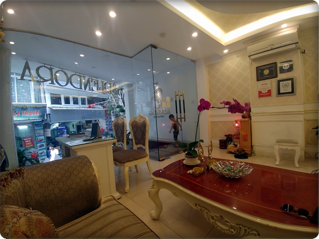드디어 호텔에 도착해서 2층 로비로 올라왔다. 올라오기 전 1층에는 하노이에서 유명한 미도리 스파 마사지가 있었다. 여행 일정 짜다가 구글맵에 별 표시만 해두었는데, 시간 될 때 아침이나 밤에 발마사지 받으러 갈 생각이다.