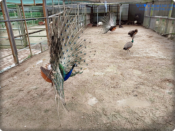 야외체험장에 있는 공작새가 마침 날개를 활짝 피고 있습니다.