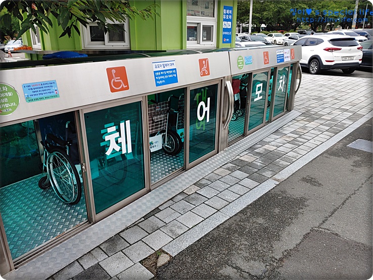 우측에 있는 안내소에서 휠체어와 유모차 대여가 가능합니다.