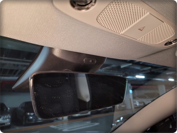 테슬라 모델3 백미러 위쪽에 내부캠이 설치 되어 있다.