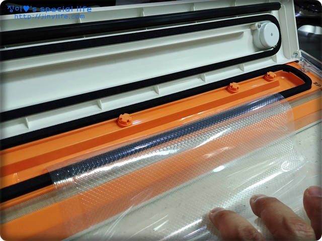 진공포장기 덮개를 닫아주고 왼편에 있는 작동 버튼을 눌러줍니다.