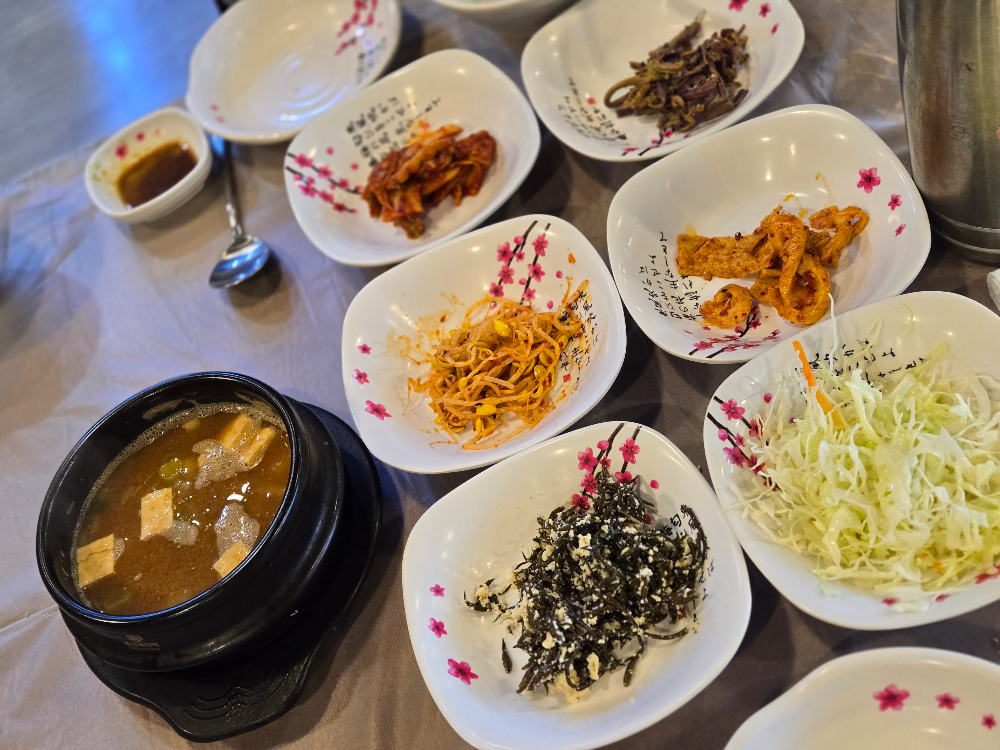 기본 밑반찬으로 나물 몇 가지랑 잡채, 샐러드, 된장찌개까지