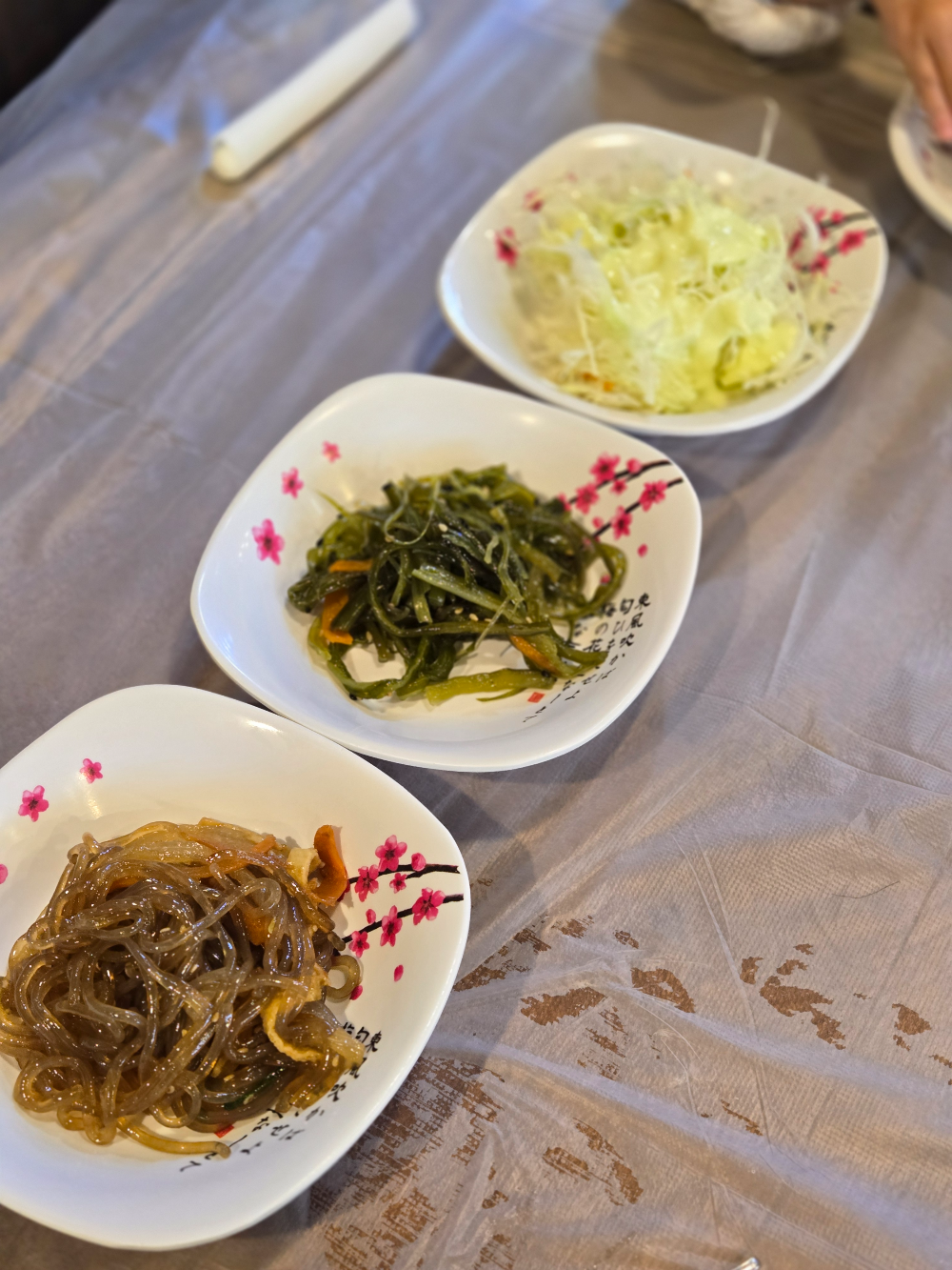 기본 밑반찬으로 나물 몇 가지랑 잡채, 샐러드, 된장찌개까지
